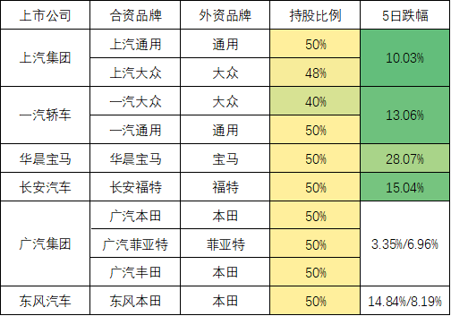 我們從股價(jià)圖上便不難發(fā)現(xiàn),與寶馬合資的華晨寶馬兩日重挫31%;與奔馳、現(xiàn)代、福田合資的北京汽車5日大跌8.33%;與日本豐田、本田、三菱合資的廣汽集團(tuán)H股三日跌6.96%,廣汽集團(tuán)A股今日跌1.98%;與大眾、通用合資的上汽集團(tuán)最近更是不斷走低,今日更是大跌4.9%,5日重挫超10%。