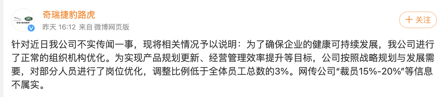 11月8日下午,奇瑞捷豹路虎官微發(fā)布消息,就近日市場不實(shí)傳聞進(jìn)行澄清。消息稱,為了確保企業(yè)的健康可持續(xù)發(fā)展,公司進(jìn)行了正常的組織機(jī)構(gòu)優(yōu)化。為實(shí)現(xiàn)產(chǎn)品規(guī)劃更新、經(jīng)營管理效率提升等目標(biāo),公司按照戰(zhàn)略規(guī)劃與發(fā)展需要,對部分人員進(jìn)行了崗位優(yōu)化,調(diào)整比例低于全體員工總數(shù)的3%。