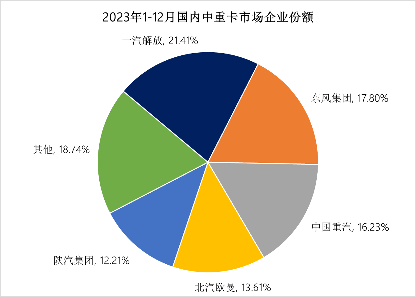 2023年的國內(nèi)中重卡市場,是行業(yè)競爭最為白熱化的“主陣地”,全年行業(yè)總銷量近77萬輛,同比增長28.3%。市場份額占10%以上的頭部企業(yè)有五家,分別是:解放21.4%、東風(fēng)17.8%、重汽16.2%、歐曼13.6%和陜汽12.2%。前五強(qiáng)企業(yè)占據(jù)了行業(yè)80%以上的市場份額。