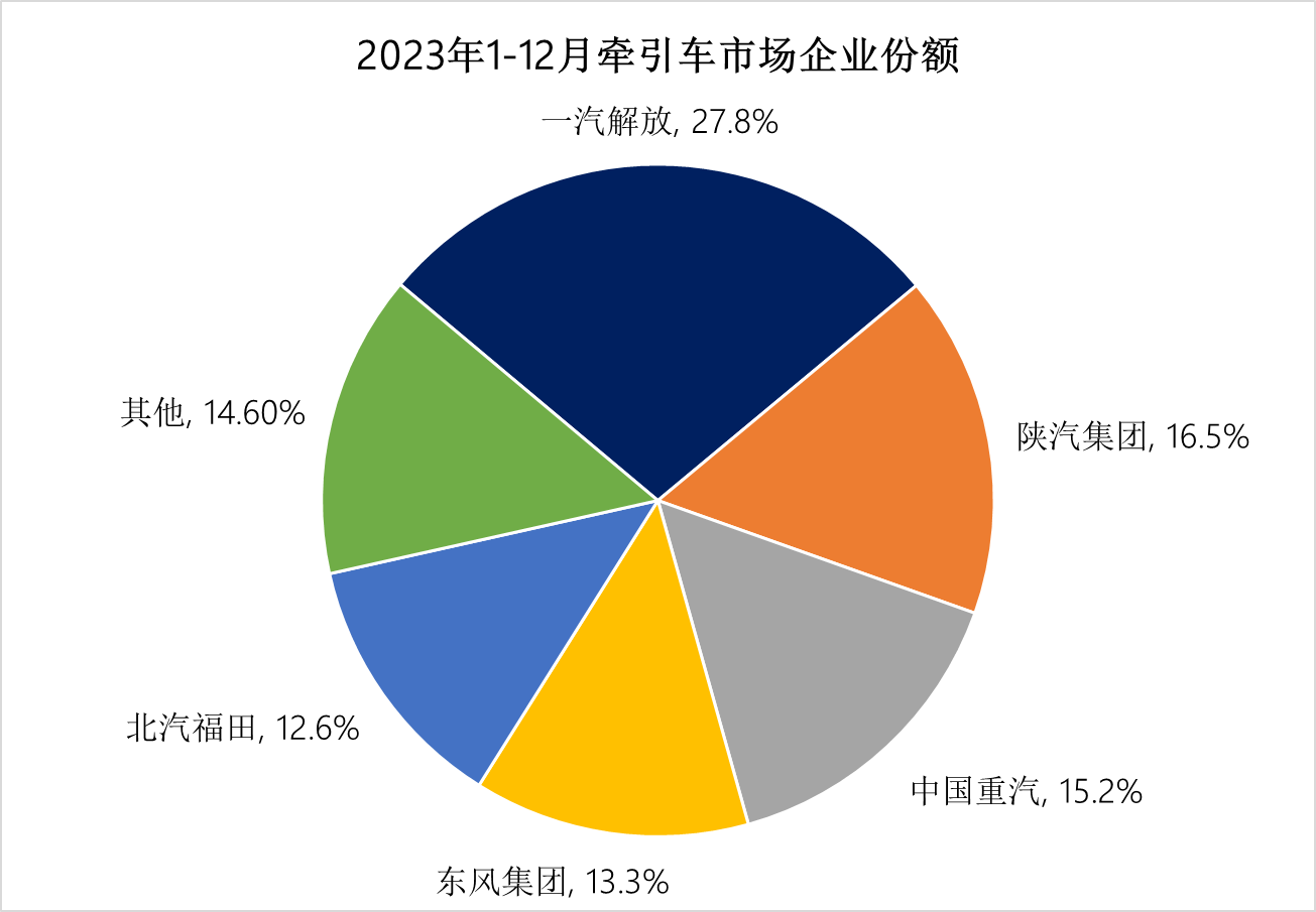 上圖可見,大多數(shù)企業(yè)2023年?duì)恳囦N量都實(shí)現(xiàn)了增長,銷量前十企業(yè)中解放、重汽、陜汽、北方奔馳和安徽江淮增速迅猛,分別增長89.2%、135.8%、60.1%、72.6%和477.9%。在2023年?duì)恳囀袌黾s15.6萬輛的“增量”中,貢獻(xiàn)量最大的是仍是排名首位的解放,牽引車銷量凈增長4.9萬輛,對(duì)整個(gè)市場增量的貢獻(xiàn)度達(dá)到31%;第二名重汽,凈增長超2萬輛,東風(fēng)、陜汽和福田也均增長超萬輛。