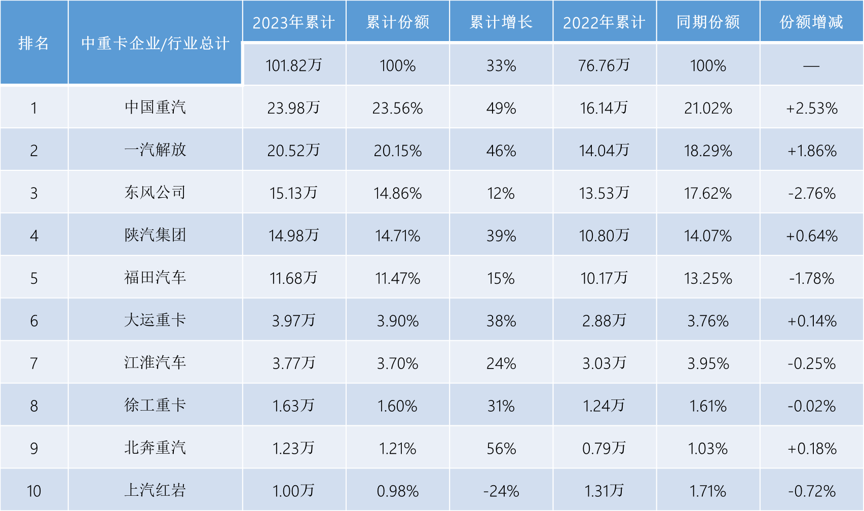 上表可見,在中重卡市場全年收獲超3成增長的大環(huán)境下,絕大多數(shù)企業(yè)都同步實(shí)現(xiàn)了增長。具體來看,2023年中重卡銷量前十家“累計(jì)增長”9增1降,實(shí)現(xiàn)增長的企業(yè)增幅均達(dá)到兩位數(shù),重汽、解放、陜汽、大運(yùn)和北奔等企業(yè)增幅高于中重卡市場整體33%的增幅,跑贏“大盤”,排名前兩位的重汽和解放中重卡銷量同比分別大增49%和46%,對(duì)2023年中重卡市場的增長貢獻(xiàn)最大。