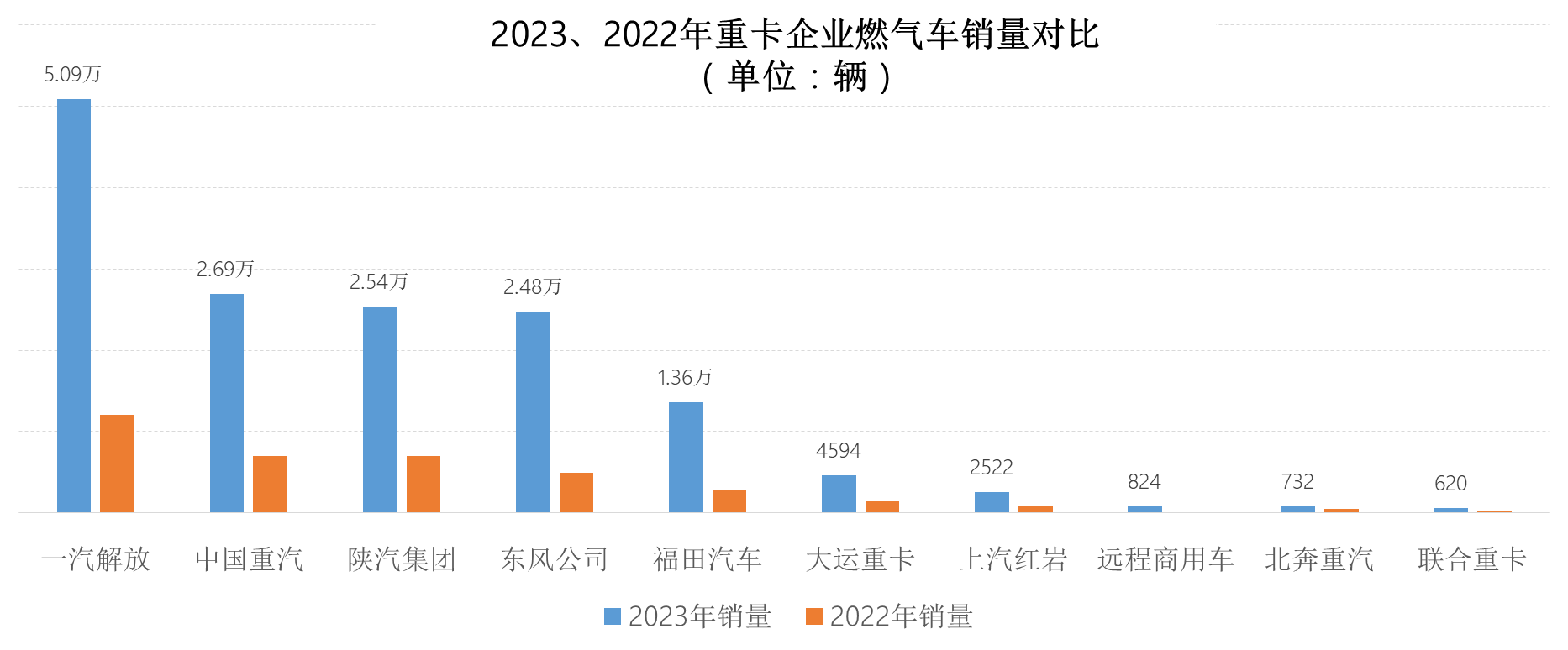 上圖可見,銷量前五企業(yè)中,解放、東風(fēng)和福田高于此增幅,分別增長323%、407%和390%。2023年天然氣重卡市場約11.5萬輛的“增量”中,主要由排名靠前的企業(yè)貢獻(xiàn),貢獻(xiàn)最大的是排名第一的解放,燃?xì)廛噧粼鲩L3.88萬輛,對(duì)整個(gè)市場增量的貢獻(xiàn)度超過1/3;重汽、陜汽、東風(fēng)和福田也均增長超萬輛。