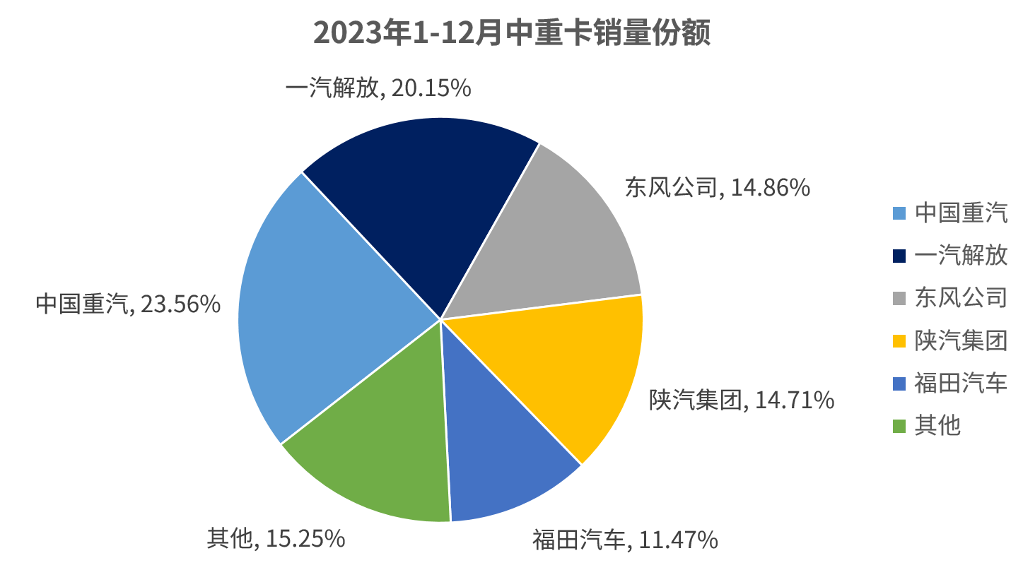 從市占率情況來看,2023年中重卡銷量前十企業(yè)合計(jì)份額達(dá)到96.12%,僅給排名靠后的企業(yè)留下不足5%的市場空間。其中,行業(yè)前五企業(yè)市場份額均超過10%,排名前兩位的重汽和解放市場份額均超20%,分別達(dá)到23.56%和20.15%。2023年,中重卡行業(yè)前五強(qiáng)合計(jì)分食了整個(gè)中重卡市場超80%的份額,領(lǐng)先優(yōu)勢巨大。