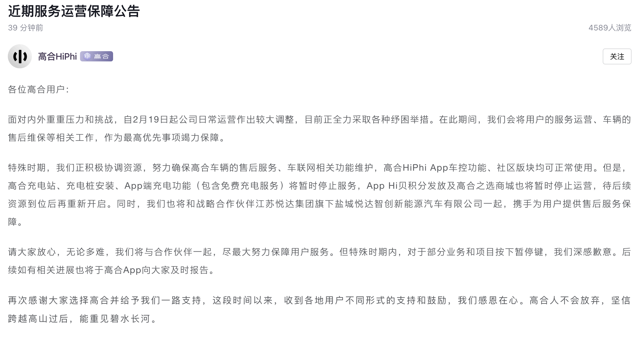 據(jù)高合汽車(chē)發(fā)布的最新公告,公司正積極協(xié)調(diào)資源,努力確保高合車(chē)輛的售后服務(wù)、車(chē)聯(lián)網(wǎng)相關(guān)功能維護(hù),高合HiPhiApp車(chē)控功能、社區(qū)版塊仍可正常使用。但是,高合充電站、充電樁安裝、App端充電功能(包含免費(fèi)充電服務(wù))將暫時(shí)停止服務(wù),AppHi貝積分發(fā)放及高合之選商城也將暫時(shí)停止運(yùn)營(yíng),待后續(xù)資源到位后再重新開(kāi)啟。