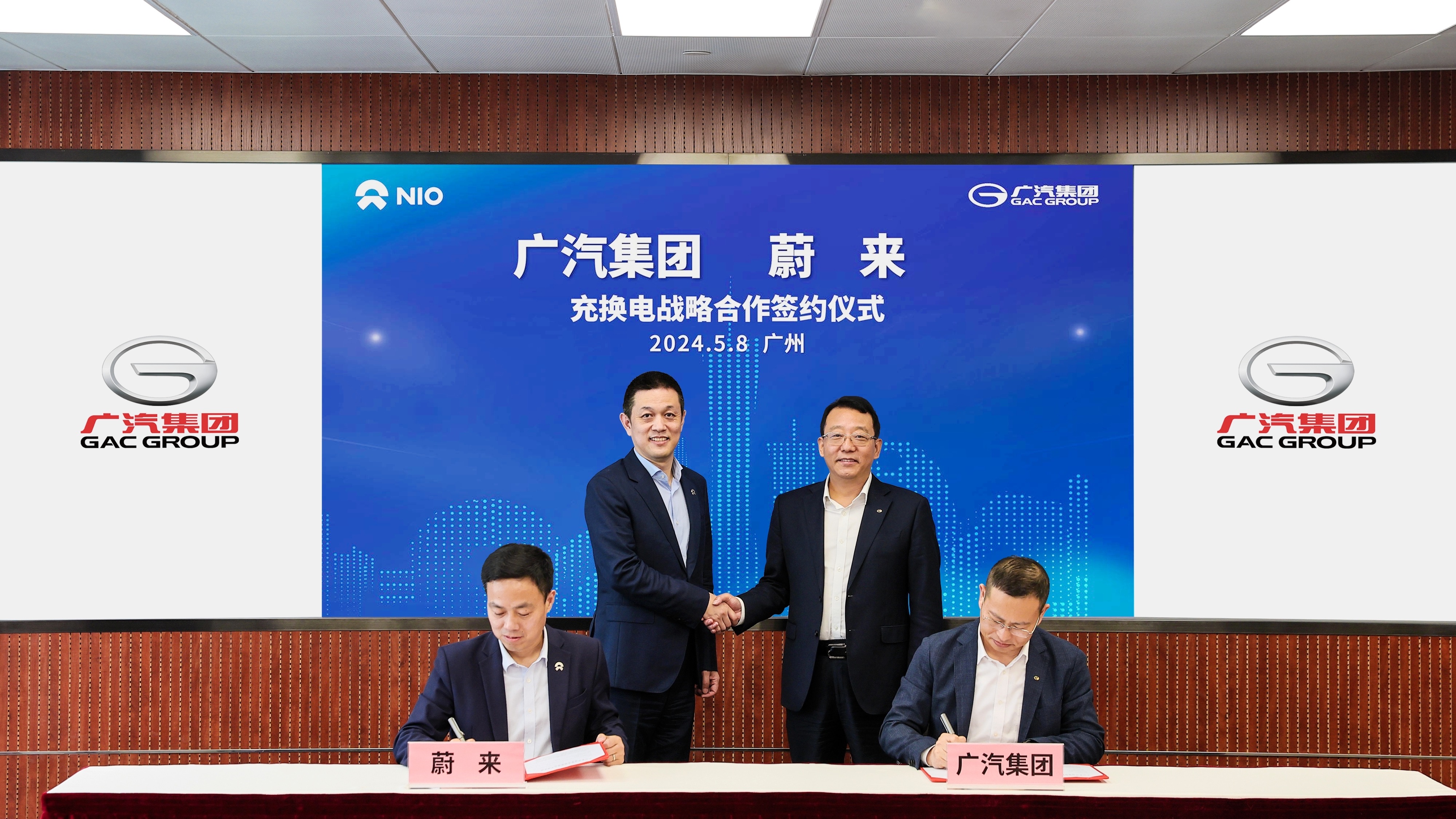 2024年5月8日,廣汽集團(tuán)與蔚來在廣汽中心簽署充換電戰(zhàn)略合作協(xié)議。在廣汽集團(tuán)總經(jīng)理馮興亞及蔚來創(chuàng)始人李斌的共同見證下,廣汽集團(tuán)副總經(jīng)理閤先慶與蔚來高級(jí)副總裁沈斐代表雙方簽約。