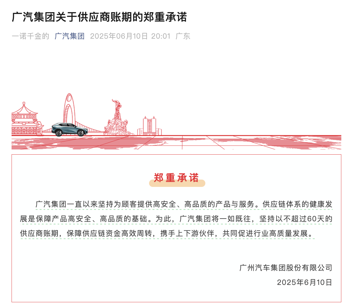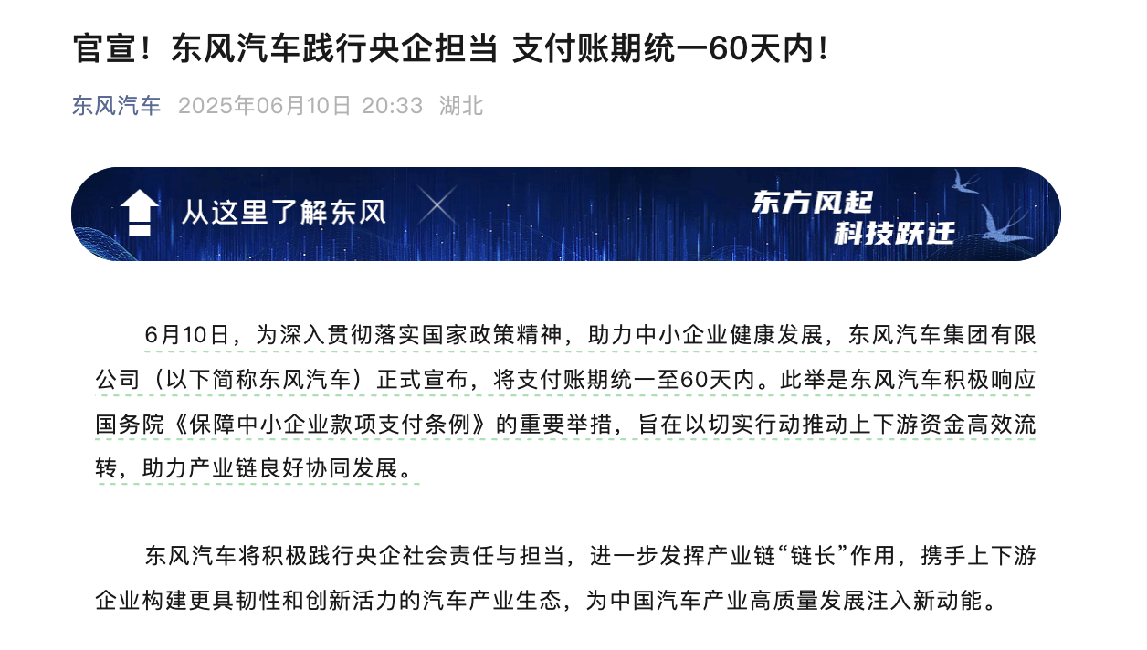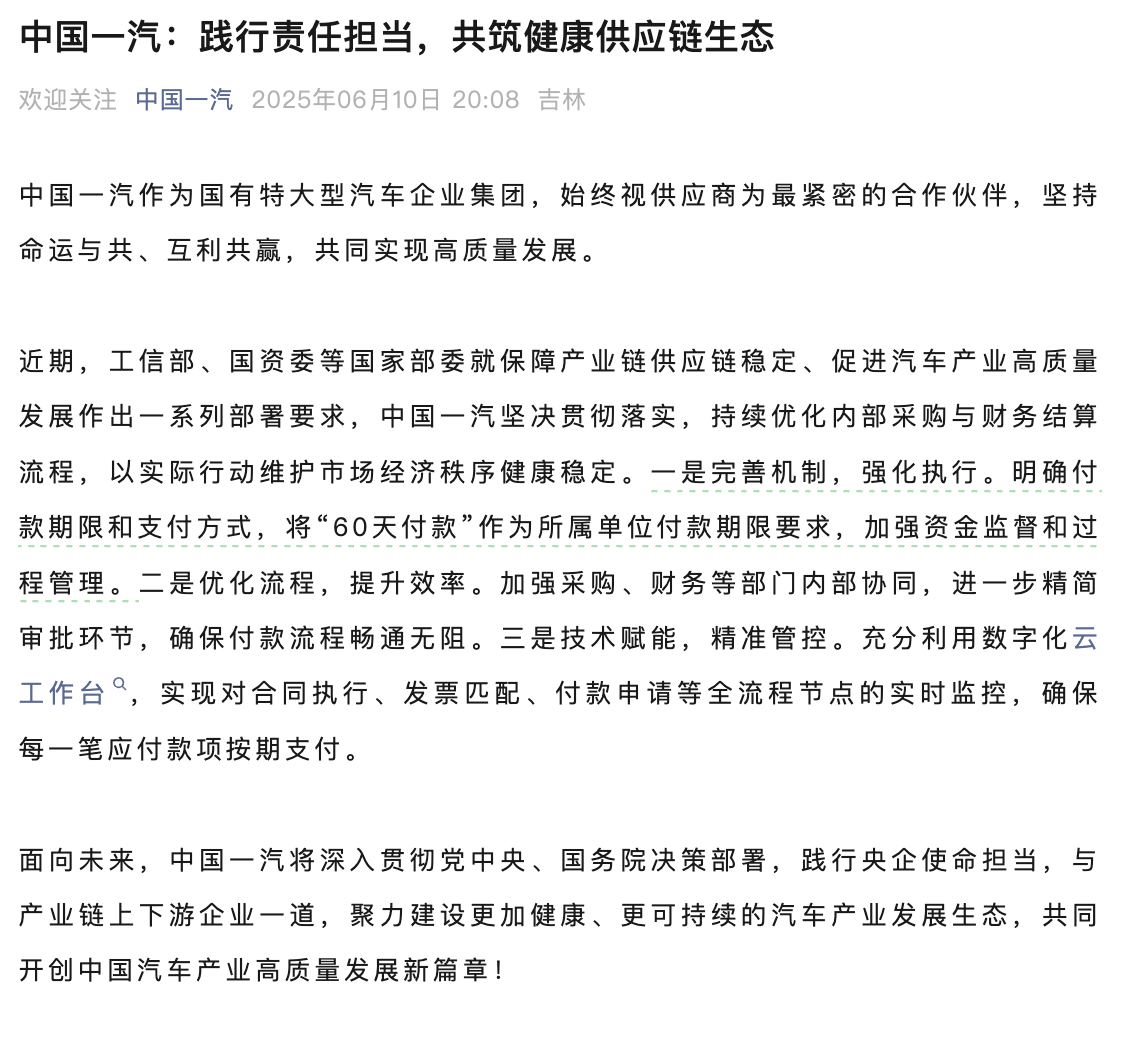 6月10日晚間,中國第一汽車集團有限公司、東風汽車集團有限公司、廣州汽車集團股份有限公司、賽力斯集團股份有限公司率先做出承諾將供應商支付賬期統(tǒng)一嚴格限定在60天以內(nèi)。隨后吉利汽車集團有限公司、重慶長安汽車股份有限公司、比亞迪股份有限公司、奇瑞汽車股份有限公司、小鵬汽車有限公司等車企跟進。這不僅是響應《條例》的強制要求,更是行業(yè)領軍者挺身而出,以實際行動抵制惡性競爭、修復產(chǎn)業(yè)生態(tài)的反內(nèi)卷宣言。