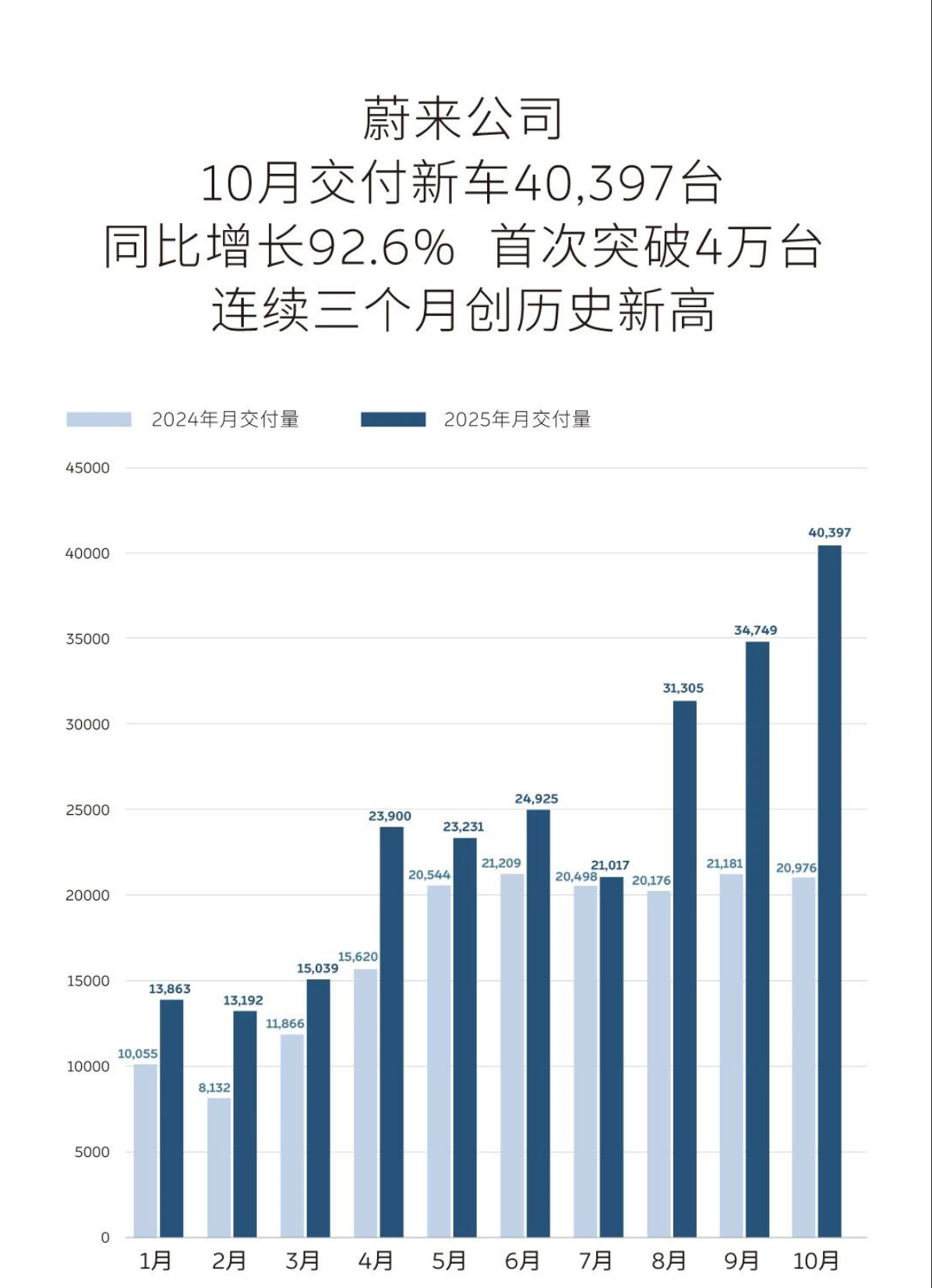 在媒體發(fā)布的這份交付榜單中,首次達(dá)成月交付量超四萬(wàn)的蔚來(lái)公司,成了唯一一個(gè)在純電賽道奮力搏殺了十一年的“孤勇犟種”。蔚來(lái)用十一年的時(shí)間,把自己變成了一家純粹又堅(jiān)定只趟純電這條并不好走的路的中國(guó)新能源車(chē)企。