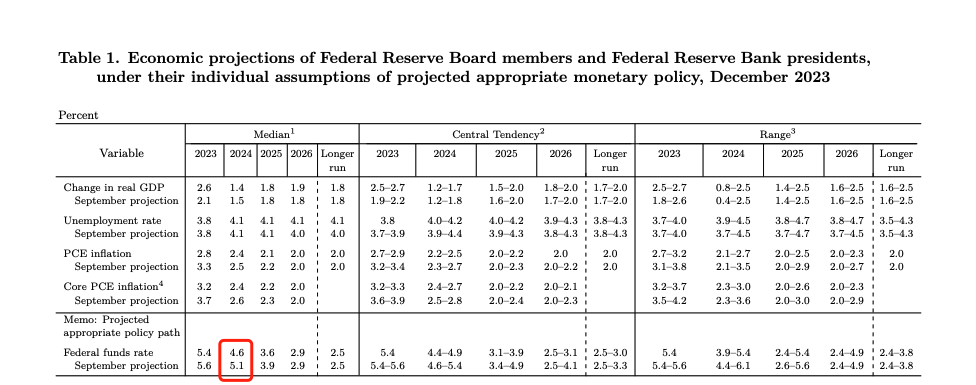 如武澤偉所言,業(yè)內(nèi)目前普遍認(rèn)為美聯(lián)儲(chǔ)的加息操作基本已“落幕”,開始押注此后的降息操作。而在本次議息會(huì)議發(fā)布的季度經(jīng)濟(jì)預(yù)測(cè)報(bào)告中,美聯(lián)儲(chǔ)也發(fā)出了迄今為止最明確的降息信號(hào)。美聯(lián)儲(chǔ)點(diǎn)陣圖暗示2024年末聯(lián)邦基金利率水平為4.6%,較9月份預(yù)期(5.1%)下修。從當(dāng)前時(shí)點(diǎn)看,這意味著2024年美聯(lián)儲(chǔ)將降息75個(gè)基點(diǎn)。
