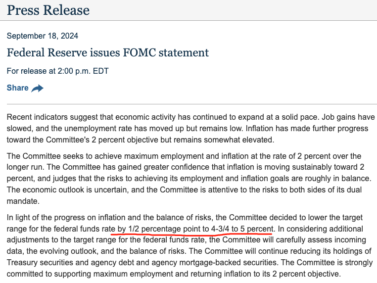 北京時(shí)間9月19日凌晨,美聯(lián)儲宣布將聯(lián)邦基金利率目標(biāo)區(qū)間下調(diào)50個(gè)基點(diǎn)至4.75%-5.00%。