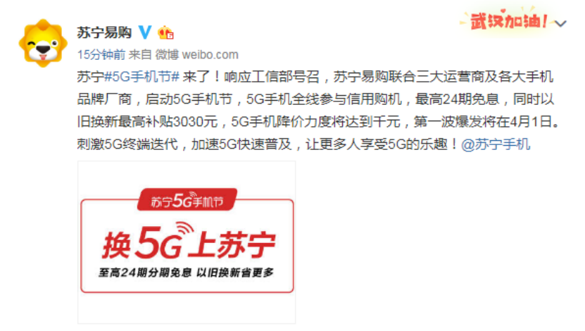3月24日,工信部發(fā)布《關(guān)于推動(dòng)5G加快發(fā)展的通知》,要求全力推進(jìn)5G網(wǎng)絡(luò)建設(shè)、應(yīng)用推廣、技術(shù)發(fā)展和安全保障,同時(shí)鼓勵(lì)基礎(chǔ)電信企業(yè)通過套餐升級(jí)優(yōu)惠、信用購機(jī)等舉措,促進(jìn)5G終端消費(fèi),加快用戶向5G遷移。響應(yīng)工信部號(hào)召,蘇寧易購在3月25日率先宣布,將聯(lián)合三大運(yùn)營商和各大手機(jī)品牌廠商啟動(dòng)5G手機(jī)節(jié)。
