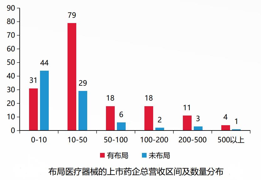 報(bào)告顯示,大型上市醫(yī)藥企業(yè)布局器械產(chǎn)業(yè)已成為顯著趨勢。隨著營收的提升,未布局醫(yī)療器械的上市藥企數(shù)量依次減少,營收超過100億元且未布局醫(yī)療器械的僅6家,而營收10億元成為布局醫(yī)療器械領(lǐng)域的分水嶺。營收低于10億元的上市藥企,布局醫(yī)療器械產(chǎn)業(yè)率僅41.3%,營收高于10億元的藥企,布局醫(yī)療器械產(chǎn)業(yè)率超過73.1%。