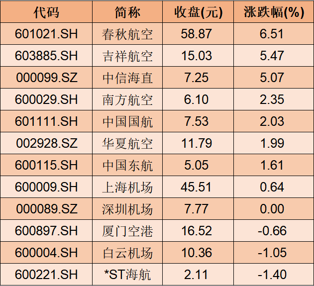 表:7月19日,機場航運板塊個股漲跌幅一覽