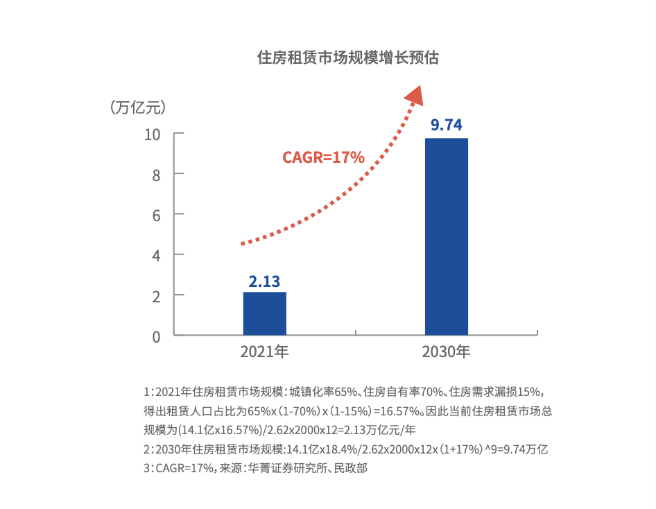 近日,《2021中國(guó)城市租住生活藍(lán)皮書(shū)》(下稱《藍(lán)皮書(shū)》)正式發(fā)布,指出基于我國(guó)城鎮(zhèn)化率年平均2%的增速,在2030年我國(guó)住房租賃市場(chǎng)規(guī)模將近10萬(wàn)億元,行業(yè)進(jìn)入發(fā)展的“黃金十年”。