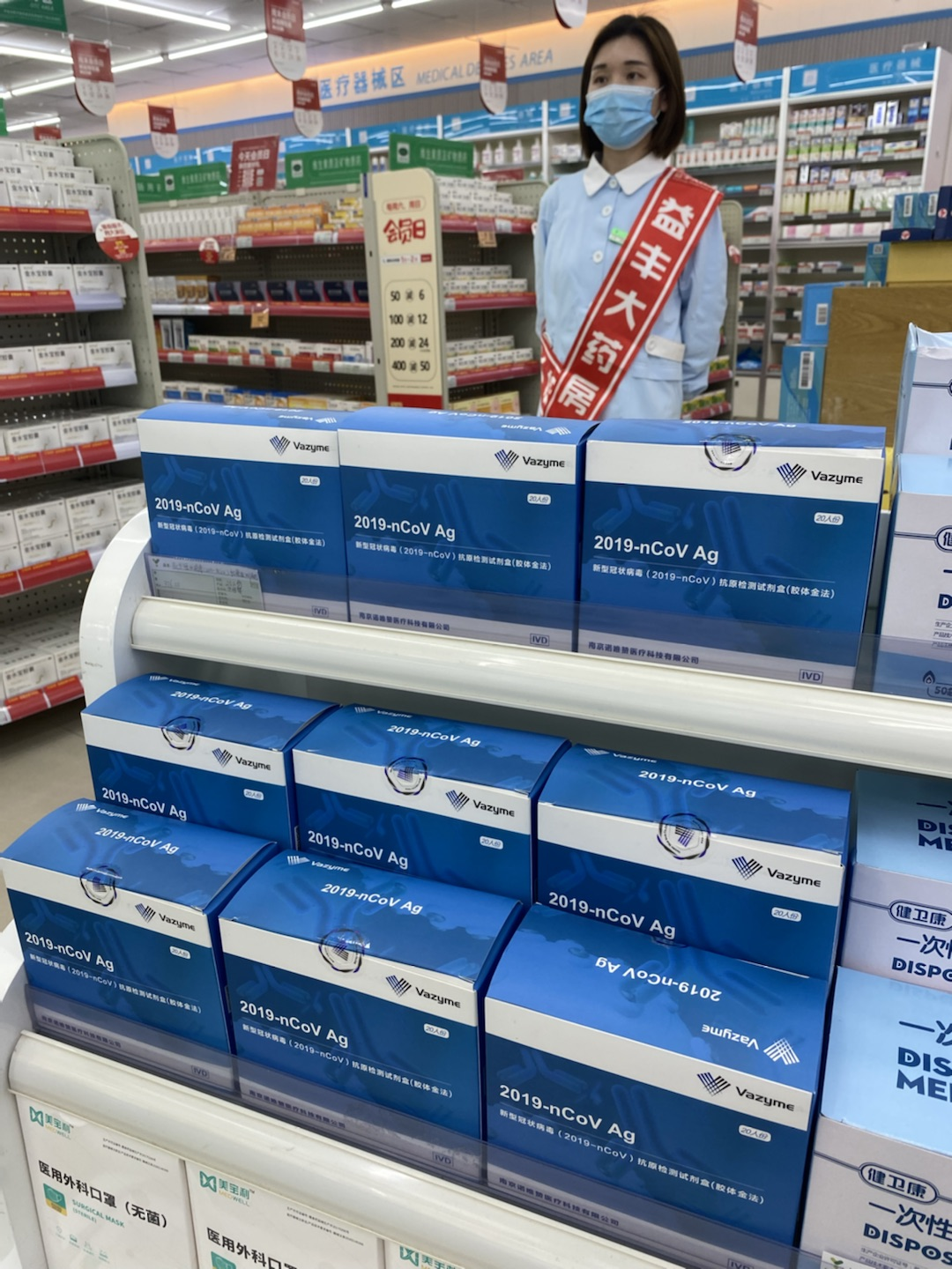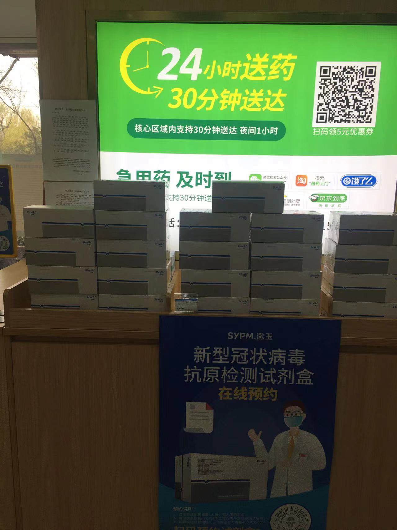 漱玉平民大藥房濟南西門店在醒目位置擺放出新冠檢測試劑盒。(攝影/趙彬彬)