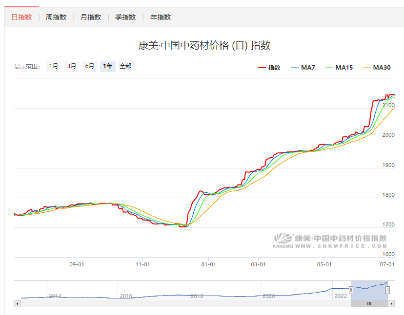 7月5日,康美中藥網(wǎng)發(fā)布的中國(guó)中藥材價(jià)格總指數(shù)報(bào)收于2145.80點(diǎn),較去年同期上漲22.94%,較上月上漲6.21%。該價(jià)格總指數(shù)包含515個(gè)品種及723個(gè)規(guī)格,為行業(yè)內(nèi)主流參考指數(shù)之一。