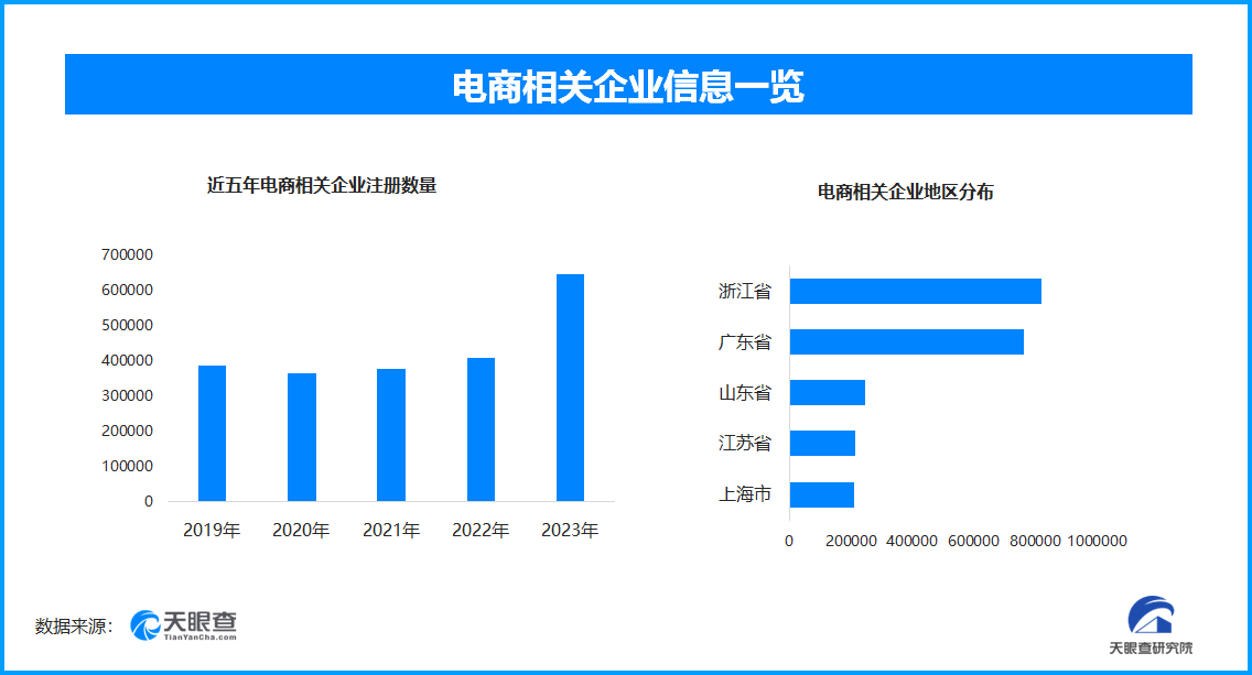 天眼查專業(yè)版數(shù)據(jù)顯示,截至目前,全國(guó)目前現(xiàn)存在業(yè)、存續(xù)狀態(tài)的電商相關(guān)企業(yè)約為375.5萬家,其中,2024年1月份-10月份新增注冊(cè)企業(yè)59.6萬余家;從電商企業(yè)年度注冊(cè)量可以看出,近5年來,電商相關(guān)企業(yè)注冊(cè)量一直保持高位增長(zhǎng),并于2023年達(dá)到頂峰。從地域分布來看,浙江省與廣東省兩個(gè)大省并駕齊驅(qū)位列榜首,注冊(cè)量分別為81.9萬家和76.2萬家;山東省、江蘇省、上海市位列其后,均為20萬家左右的量級(jí)。