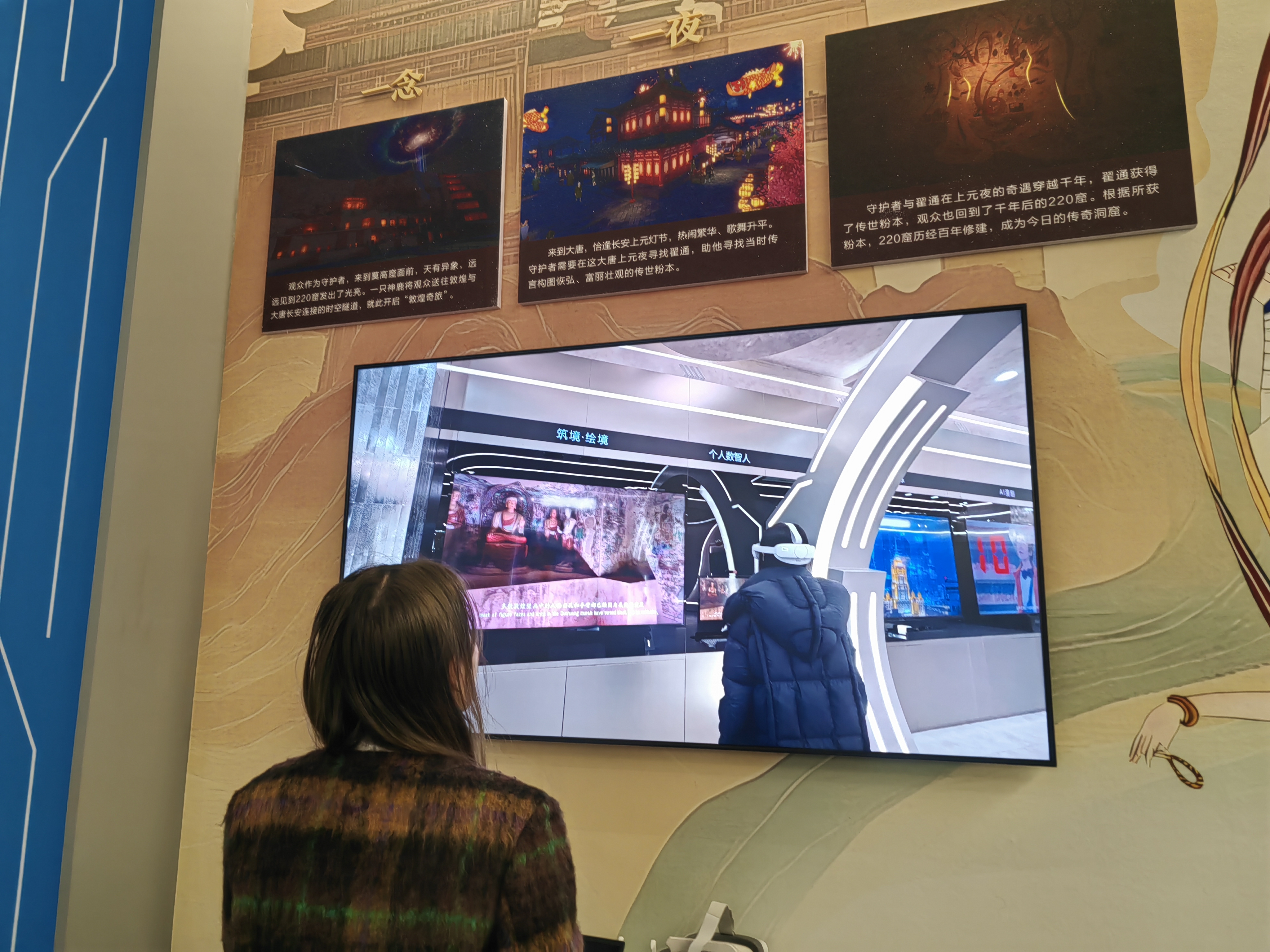 在互動(dòng)體驗(yàn)方面,展覽對(duì)展陳設(shè)計(jì)進(jìn)行了優(yōu)化完善,為觀眾提供了豐富的互動(dòng)體驗(yàn)。咪咕文化科技有限公司(中國(guó)移動(dòng)咪咕公司)市場(chǎng)規(guī)劃經(jīng)理張敏協(xié)助現(xiàn)場(chǎng)觀眾佩戴設(shè)備體驗(yàn)擴(kuò)展現(xiàn)實(shí)(XR)場(chǎng)景《敦煌奇旅》。
