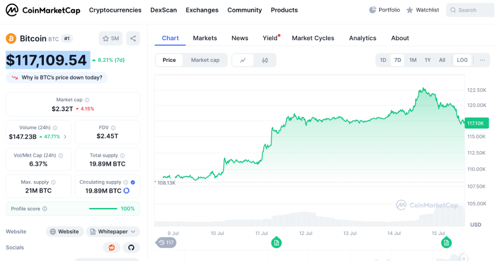不過,此后比特幣價格有所回調(diào),截至7月15日記者發(fā)稿時,1枚比特幣價格報117109.54美元,當(dāng)日跌幅約為4%,但整體看,最近7個交易日比特幣價格上漲幅度仍錄得約8.2%。