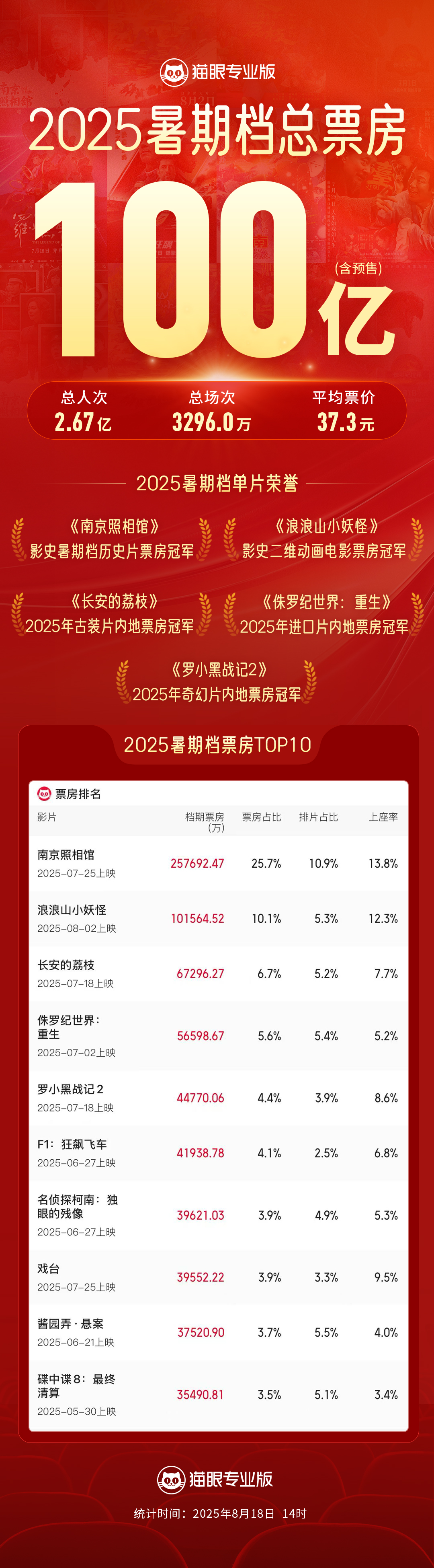 本報(bào)訊 (記者賀王娟)截至8月18日14時(shí)28分,2025年暑期檔總票房(含預(yù)售)突破100億元!觀影總?cè)舜芜_(dá)2.67億,總場(chǎng)次3296萬場(chǎng)。檔期內(nèi)票房前五名的影片分別為《南京照相館》《浪浪山小妖怪》《長(zhǎng)安的荔枝》《侏羅紀(jì)世界:重生》《羅小黑戰(zhàn)記2》。其中,《南京照相館》以超25億元的累計(jì)票房強(qiáng)勢(shì)領(lǐng)跑2025年暑期檔。