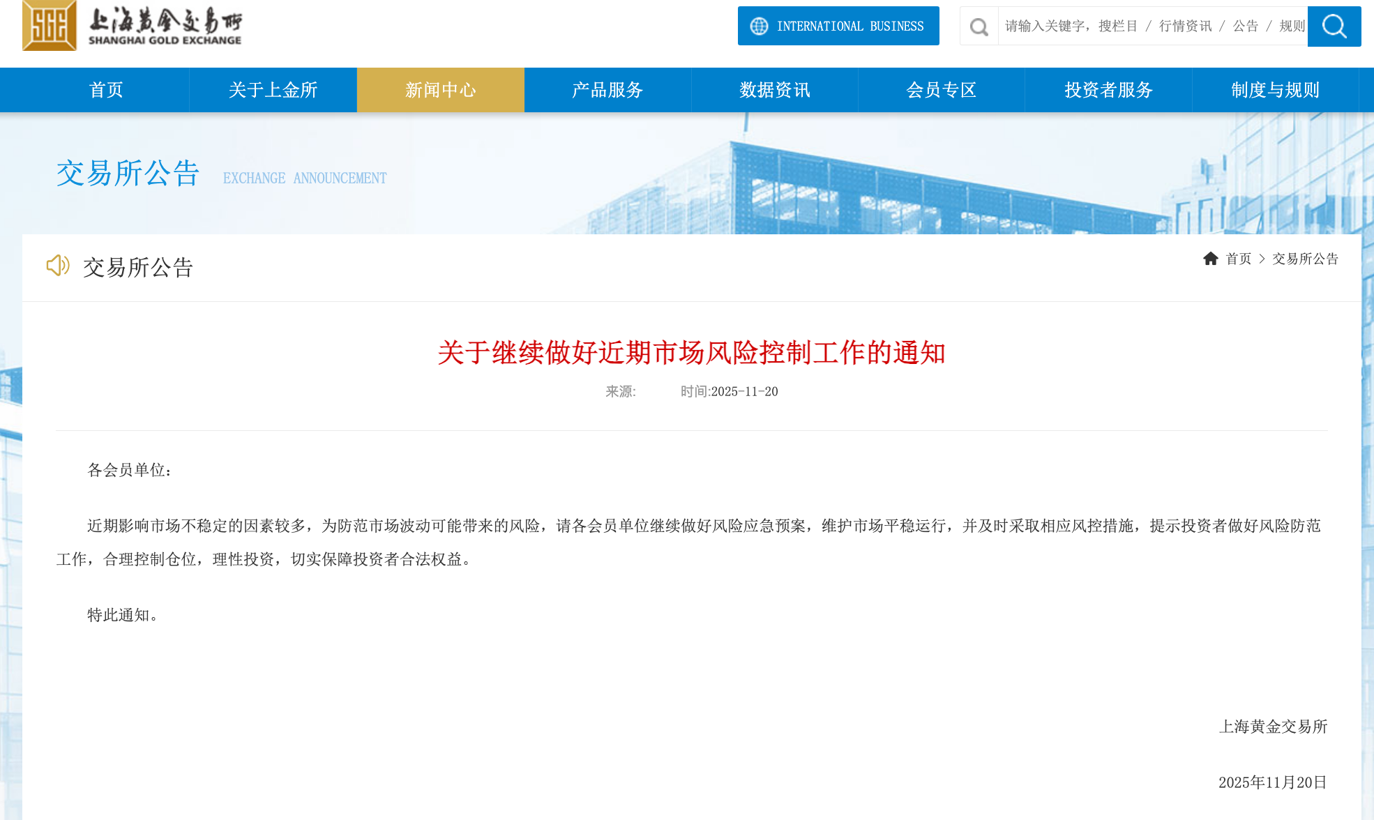 11月20日,上海黃金交易所發(fā)布《關(guān)于繼續(xù)做好近期市場(chǎng)風(fēng)險(xiǎn)控制工作的通知》(以下簡(jiǎn)稱《通知》)?!锻ㄖ繁硎?,近期影響市場(chǎng)不穩(wěn)定的因素較多,為防范市場(chǎng)波動(dòng)可能帶來(lái)的風(fēng)險(xiǎn),請(qǐng)各會(huì)員單位繼續(xù)做好風(fēng)險(xiǎn)應(yīng)急預(yù)案,維護(hù)市場(chǎng)平穩(wěn)運(yùn)行,并及時(shí)采取相應(yīng)風(fēng)控措施,提示投資者做好風(fēng)險(xiǎn)防范工作,合理控制倉(cāng)位,理性投資,切實(shí)保障投資者合法權(quán)益。