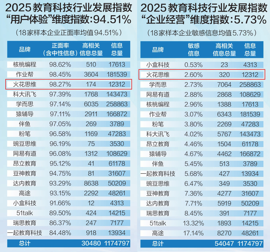 火花思維自成立以來,專注于青少年邏輯思維訓(xùn)練及綜合素質(zhì)的提升。在2025指數(shù)榜單中,火花思維榮獲用戶體驗與企業(yè)經(jīng)營兩大維度前三的佳績。
