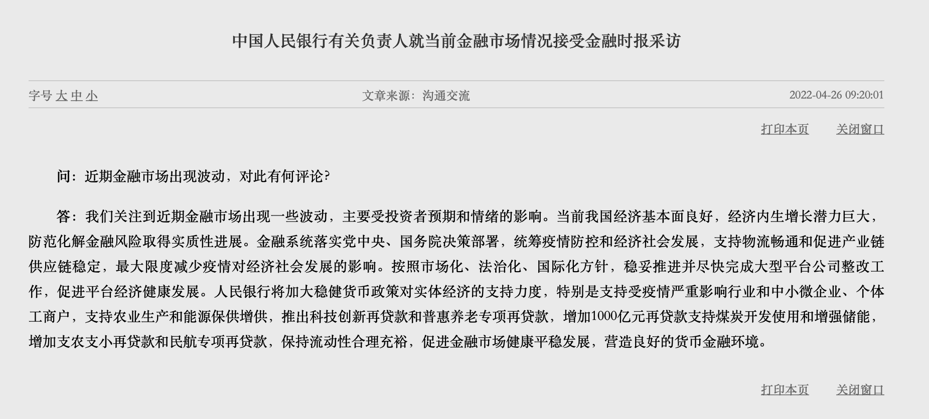 4月26日上午9時(shí)20分,中國(guó)人民銀行有關(guān)負(fù)責(zé)人就當(dāng)前金融市場(chǎng)情況接受金融時(shí)報(bào)采訪時(shí)表示,人民銀行關(guān)注到近期金融市場(chǎng)出現(xiàn)一些波動(dòng),主要受投資者預(yù)期和情緒的影響。當(dāng)前我國(guó)經(jīng)濟(jì)基本面良好,經(jīng)濟(jì)內(nèi)生增長(zhǎng)潛力巨大,防范化解金融風(fēng)險(xiǎn)取得實(shí)質(zhì)性進(jìn)展。