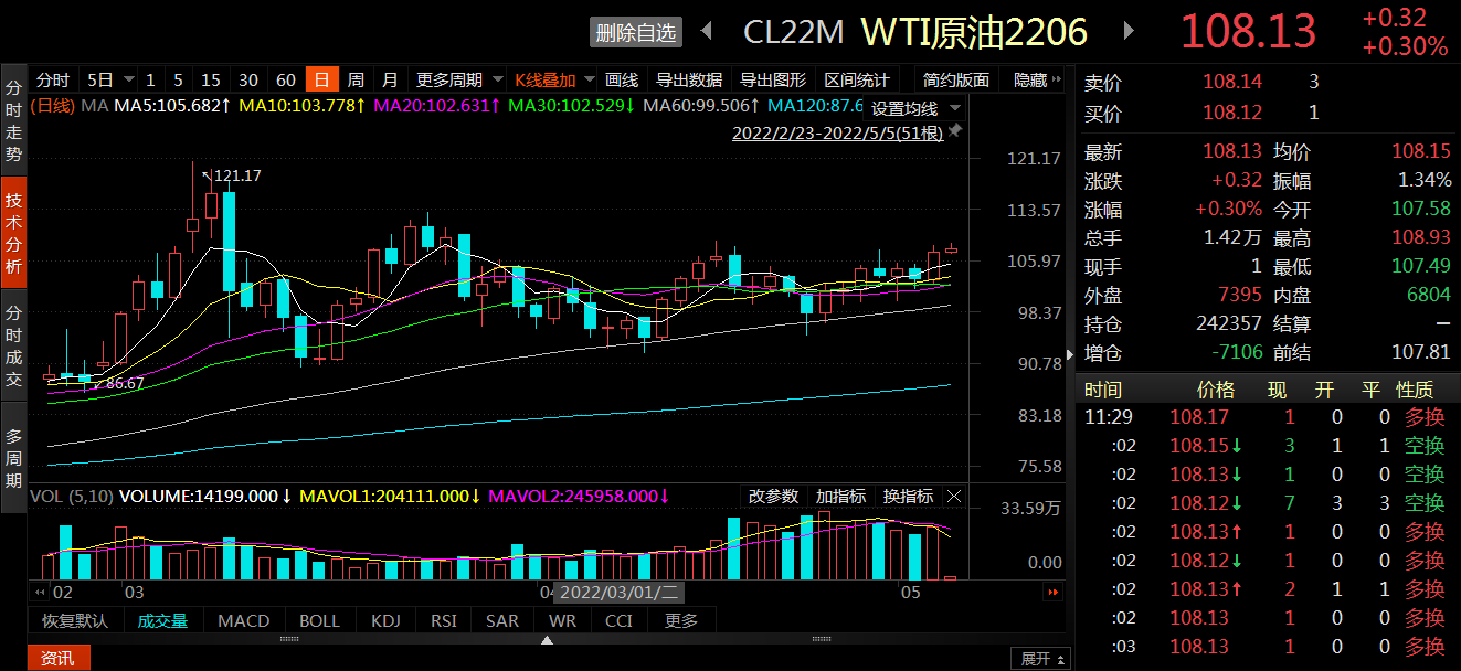 東方財(cái)富Choice數(shù)據(jù)顯示,截至北京時(shí)間2022年5月5日6:00,ICE布倫特原油期貨主力合約收于110.22美元/桶,上漲5.00%;截至北京時(shí)間2022年5月5日5:00,NYMEXWTI原油期貨主力合約收于107.55美元/桶,漲幅5.02%,期間最高上漲至108.61美元/桶,為4月18日以來新高。