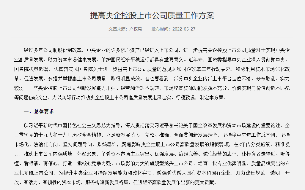 5月27日,國務院國資委對外發(fā)布《提高央企控股上市公司質量工作方案》(以下簡稱《工作方案》),從四個方面提出14項具體工作舉措,涵蓋推進上市、公司治理、日常運營、資本運作、科技創(chuàng)新、人才培養(yǎng)、風險防控、市場表現(xiàn)等上市公司改革發(fā)展的關鍵環(huán)節(jié)。