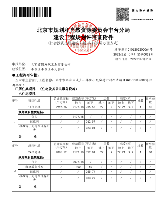 北京首鋼海賦置業(yè)有限公司于2022年6月1日通過掛牌出讓形式取得豐臺區(qū)小瓦窯村XWY-13地塊項目建設(shè)用地使用權(quán),拿地后僅30天就取得了建設(shè)工程規(guī)劃許可證,繼華潤置地紀(jì)家廟項目后,再次刷新了豐臺區(qū)集中供地以來辦理建設(shè)工程規(guī)劃許可證的記錄。