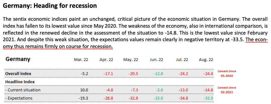 素有“歐洲經(jīng)濟(jì)火車頭”之稱的德國,在此次調(diào)研中情況也不容樂觀。德國8月份投資者信心指數(shù)錄得-24.4,為2020年5月份來新低;投資者對(duì)經(jīng)濟(jì)現(xiàn)狀的信心指數(shù)錄得-14.8,較前值繼續(xù)下降1.8,為2021年2月份來新低。報(bào)告稱,“德國經(jīng)濟(jì)正在‘堅(jiān)定’走向衰退。”
