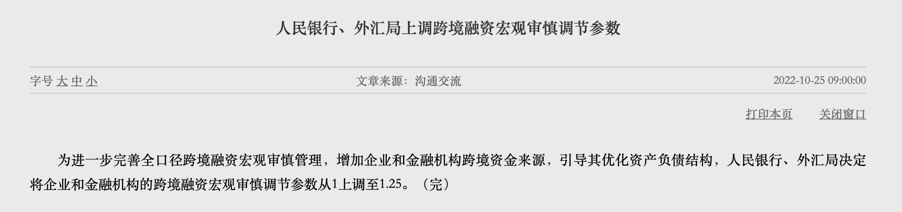 10月25日,中國(guó)人民銀行發(fā)布消息,為進(jìn)一步完善全口徑跨境融資宏觀審慎管理,增加企業(yè)和金融機(jī)構(gòu)跨境資金來源,引導(dǎo)其優(yōu)化資產(chǎn)負(fù)債結(jié)構(gòu),人民銀行、外匯局決定將企業(yè)和金融機(jī)構(gòu)的跨境融資宏觀審慎調(diào)節(jié)參數(shù)從1上調(diào)至1.25。