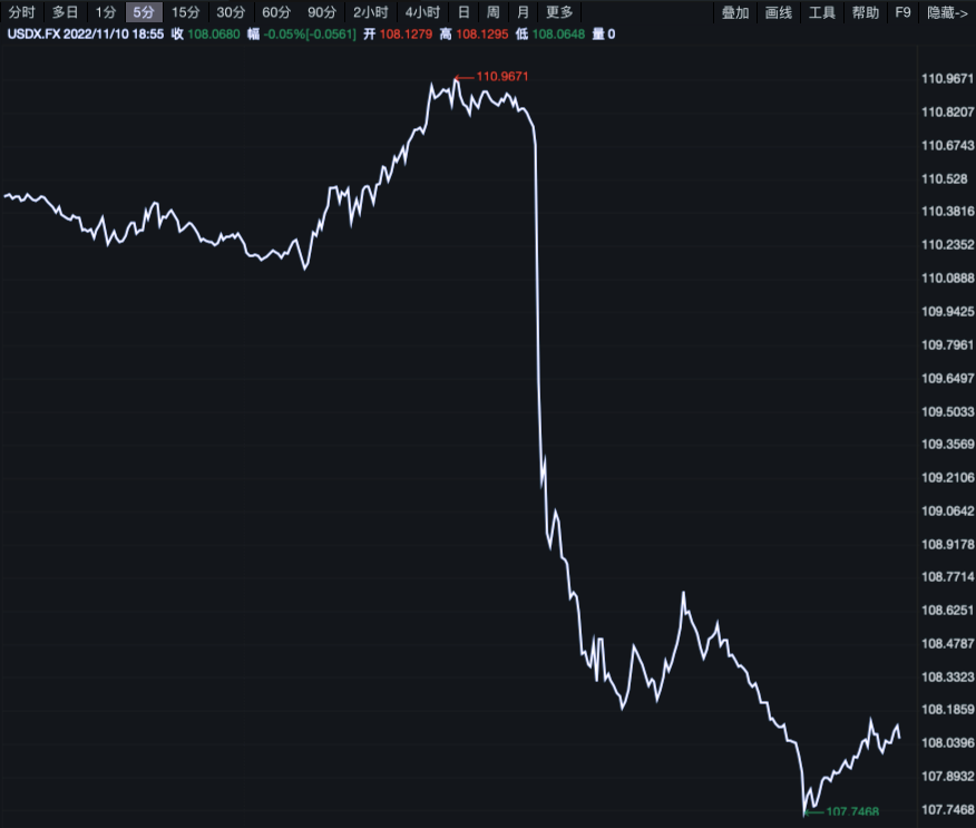 美元指數(shù)亦出現(xiàn)較大幅度下行,當(dāng)?shù)貢r(shí)間11月10日紐約尾盤,美元指數(shù)跌逾2.3%報(bào)107.88,盤中創(chuàng)2009年以來(lái)最大跌幅,非美貨幣對(duì)美元匯率出現(xiàn)普遍上漲。