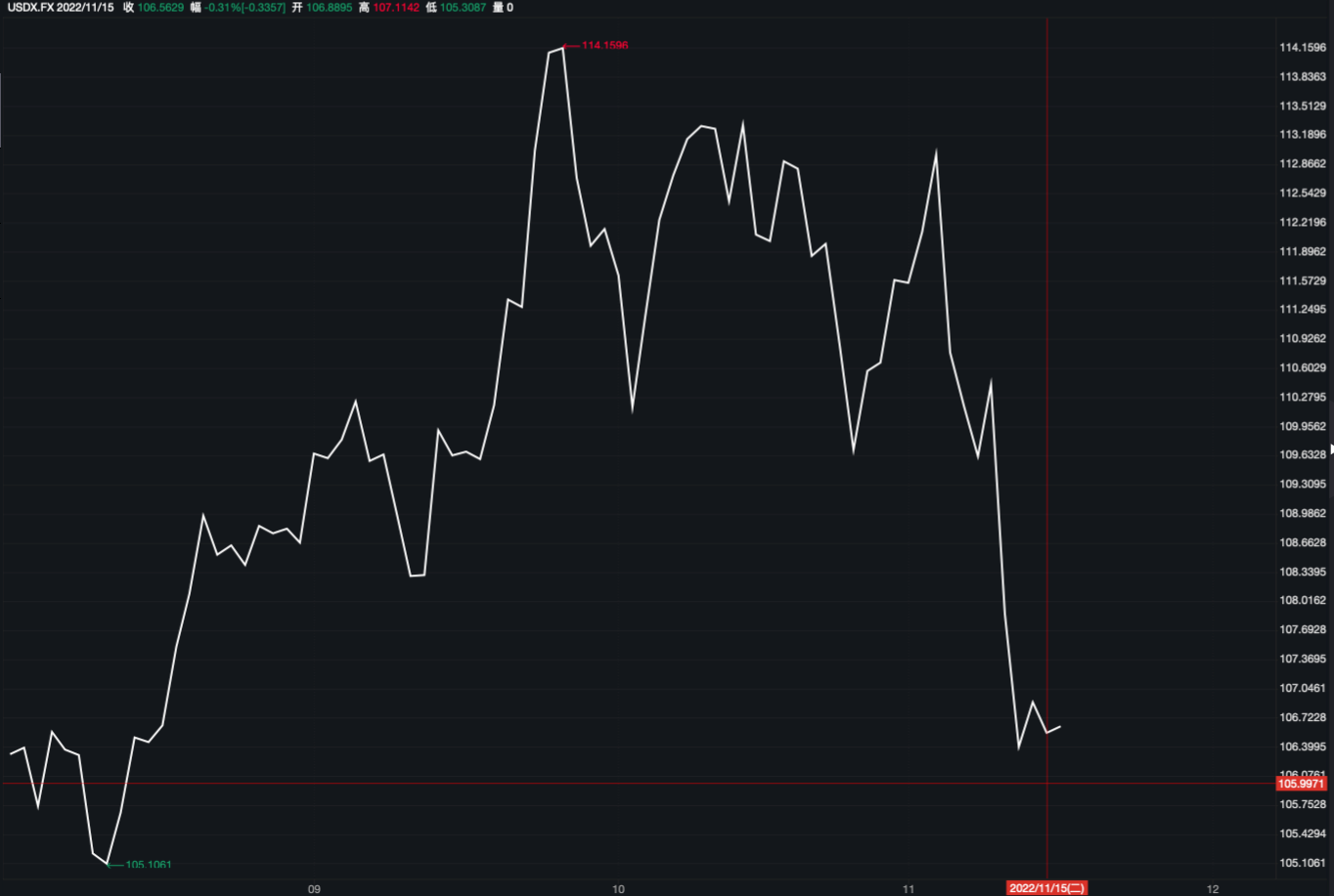 美元指數(shù)在PPI數(shù)據(jù)影響下,一度短線跌超1%,日內(nèi)最低探至105.3087點,也是自今年8月中旬以來首次跌破106關(guān)口。