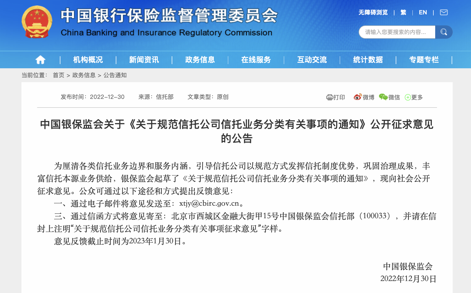 12月30日,銀保監(jiān)會官網(wǎng)發(fā)布《關(guān)于規(guī)范信托公司信托業(yè)務(wù)分類有關(guān)事項的通知(征求意見稿)》(以下簡稱《通知》)。