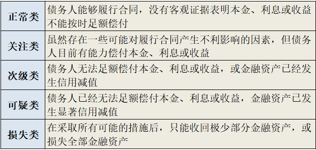 具體來看,金融資產(chǎn)按照風(fēng)險(xiǎn)程度分為五類,分別為正常類、關(guān)注類、次級類、可疑類、損失類,后三類合稱不良資產(chǎn)。(具體如下圖)