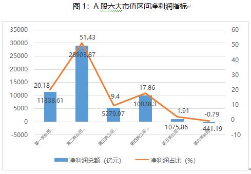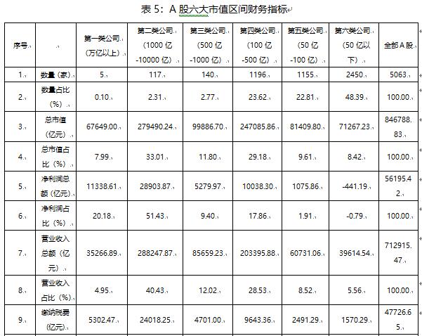 2022年,A股市場(chǎng)頭部效應(yīng)顯著,高市值上市公司經(jīng)營業(yè)績表現(xiàn)極為優(yōu)秀。將A股上市公司按照市值分成六大區(qū)間(見下表),數(shù)據(jù)顯示,千億市值以上的上市公司數(shù)量為122家,占比2.41%,市值規(guī)模達(dá)到34.71萬億元,占比40.99%。從盈利指標(biāo)來看,千億級(jí)上市公司的營業(yè)收入總額達(dá)到32.35萬億元,占比45.38%;凈利潤總額達(dá)到4.02萬億元,占比71.61%。其中,萬億市值以上的上市公司有5家,分別為貴州茅臺(tái)、工商銀行、建設(shè)銀行、中國移動(dòng)、農(nóng)業(yè)銀行,其合計(jì)總市值、營業(yè)收入、凈利潤分別為6.76萬億元,3.53萬億元和1.13萬億元,占A股上市公司相同指標(biāo)總額的比重分別為7.99%、4.95%和20.18%;其平均凈利潤和營業(yè)收入分別達(dá)到2267.72億元和7053.38億元,均遠(yuǎn)超其他類別的上市公司。