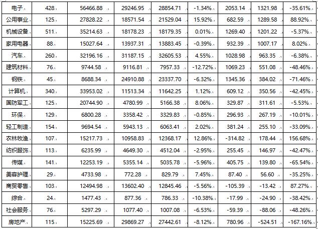凈利潤出現(xiàn)虧損且虧損面在30%以上的有7大行業(yè),分別是社會(huì)服務(wù)、綜合、傳媒、計(jì)算機(jī)、商貿(mào)零售、房地產(chǎn)和紡織服飾,其虧損面和虧損上市公司家數(shù)分別為48.68%(37家)、45.83%(11家)、34.75%(49家)、34.41%(117家)、33.98%(35家)、33.91(39家)和33.63%(38家)。其中前兩大行業(yè)的占比更是接近50%,此外,計(jì)算機(jī)和醫(yī)藥生物的虧損公司數(shù)量分別達(dá)到117家和100家,行業(yè)經(jīng)營業(yè)績壓力較大。