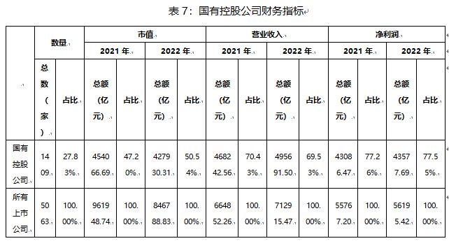 相較于民營控股公司,國有控股公司有1409家,數(shù)量占比27.83%,不足A股市場(chǎng)總公司數(shù)量的1/3,但其市值占比已于2022年超過50%,且營業(yè)收入和凈利潤持續(xù)保持同比增長,分別達(dá)到了49.57萬億元,占比69.53%,和4.36萬億元,占比77.55%,是上市公司增長的主要貢獻(xiàn)者。
