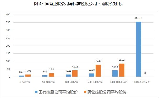 但是,對(duì)比國有控股公司和民營控股公司的盈利表現(xiàn)來看,我們發(fā)現(xiàn):(1)從平均凈資產(chǎn)收益率指標(biāo)看,市值在100-500億元和1000-10000億元的兩類區(qū)間中(2022年底,民營控股公司沒有萬億市值以上的公司),國有控股上市公司的平均凈資產(chǎn)收益率都低于民營控股公司的相同指標(biāo),特別是在市值1000-10000億元的區(qū)間中,民營控股公司的平均凈資產(chǎn)收益率是國有控股公司系統(tǒng)指標(biāo)的1.79倍。(2)從平均利息費(fèi)用指標(biāo)看,國有控股公司的利息費(fèi)用在所有市值區(qū)間,都明顯公司高于民營控股公司,特別是,在市值500-1000億元的區(qū)間中,國有控股公司的平均利息費(fèi)用15.93億元,民營控股公司的平均利息費(fèi)用是5.16億元,前者是后者的3.09倍。在市值1000-10000億元的區(qū)間中,國有控股公司的平均利息費(fèi)用是38.52億元,民營控股公司的相同指標(biāo)是8.88億元,前者是后者的4.34倍。(3)從PE倍數(shù)看,在市值500億元以下的區(qū)間中,國有控股公司的平均PE都高于民營控股公司,但是,在市值500-1000億元和1000-10000億元的兩個(gè)區(qū)間中,國有控股公司的平均PE分別為41.32倍和18.58倍,都明顯低于民營控股公司的平均PE的81.03倍和53.47倍。(4)從平均股價(jià)看,無論在哪一類市值區(qū)間,國有控股公司的股價(jià)都低于民營控股公司的股價(jià),其中,在500-1000億元市值區(qū)間,民營控股公司的平均股價(jià)79.47元,甚至達(dá)到國有控股公司相同指標(biāo)(22.08元)的3.60倍;在市值1000-10000億元區(qū)間內(nèi),民營控股公司的平均股價(jià)85.82元是國有控股公司相同指標(biāo)(42.52元)的2.02倍。