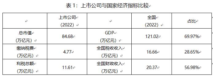 2022年,A股上市公司共繳納稅費(fèi)4.77萬億元,占全國稅收收入總額(16.66萬億元)的28.65%;上市公司總利稅為11.61萬億元,占全國財(cái)政收入的56.98%。