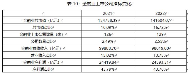 2022年,金融業(yè)上市公司數(shù)量增加了3家,達(dá)129家,總市值14.16萬億元,相較于2021年下降了8.50%,數(shù)量和總市值分別占A股公司總量的2.55%和16.72%。金融業(yè)上市公司當(dāng)年的營收和凈利潤增速有所放緩,其中,營業(yè)收入為9.80萬億元,同比下降1.87%,比上年減少了1.28個(gè)百分點(diǎn);但創(chuàng)利水平穩(wěn)定,凈利潤達(dá)2.45萬億元,同比上升0.71%。雖然金融業(yè)上市公司占A股公司總量的比例僅為2.55%,但是其創(chuàng)造的凈利潤占A股凈利潤總額的比重高達(dá)43.76%,幾近半壁江山。