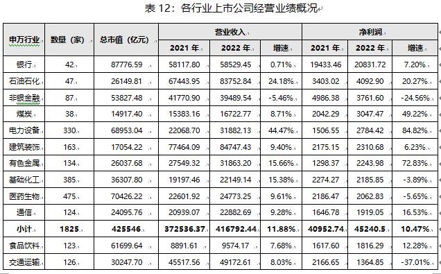 按照申萬行業(yè)分類并對(duì)比各行業(yè)的業(yè)績指標(biāo),2022年上市公司凈利潤總額排名前十的行業(yè)分別為銀行、石油石化、非銀金融、煤炭、電力設(shè)備、建筑裝飾、電力設(shè)備、有色金屬、基礎(chǔ)化工、醫(yī)藥生物和通信。十大行業(yè)上市公司總數(shù)為1825家,占A股公司總量的36.05%,總市值合計(jì)為42.55萬億元,占比50.25%;營業(yè)收入41.68萬億元,占比58.47%;凈利潤4.52萬億元,占比80.43%。其中,得益于中國綠色能源版圖快速擴(kuò)容和新能源技術(shù)快速發(fā)展等因素,電力設(shè)備和有色金屬兩大行業(yè)的創(chuàng)利創(chuàng)收水平表現(xiàn)優(yōu)異,兩者均實(shí)現(xiàn)了營收凈利的雙增長,且同比增速超過其他大部分行業(yè)。