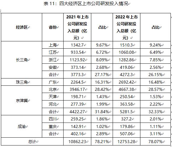 從長三角、珠三角、京津冀和成渝四個(gè)經(jīng)濟(jì)區(qū)的上市公司研發(fā)投入情況來看,京津冀的研發(fā)投入總額及占比均為兩年最高,長三角次之。其中,北京2022年上市公司研發(fā)投入總額達(dá)到4667.38億元,占比近30%,遠(yuǎn)超其他省份,而各經(jīng)濟(jì)區(qū)上市公司研發(fā)投入的穩(wěn)定增長正是響應(yīng)創(chuàng)新驅(qū)動(dòng)發(fā)展戰(zhàn)略的重要表現(xiàn)。
