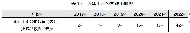 2022年,A股市場(chǎng)共計(jì)退市42家上市公司,創(chuàng)下退市數(shù)量新高,其中,有24家上市公司因被*ST后首個(gè)會(huì)計(jì)年度被會(huì)計(jì)師事務(wù)所出具無法表示意見或者否定意見的審計(jì)報(bào)告而退市,“非標(biāo)退市”已經(jīng)成為推動(dòng)資本市場(chǎng)優(yōu)勝劣汰中非常重要的一環(huán),1家上市公司因連續(xù)20個(gè)交易日的每日股票收盤價(jià)均低于人民幣1元而被退市。板塊情況來看,不同板塊退市公司數(shù)量分別為滬主板18家、深主板16家、創(chuàng)業(yè)板8家。行業(yè)情況來看,退市公司數(shù)量最多的前4個(gè)行業(yè)分別為傳媒(7家)、非銀金融(4家)、醫(yī)藥生物(3家)、社會(huì)服務(wù)(3家)。隨著注冊(cè)制改革的進(jìn)一步深化,可以預(yù)見上市公司退市將逐步常態(tài)化,上市公司只有堅(jiān)守合規(guī)底線,才能保證基業(yè)長青。