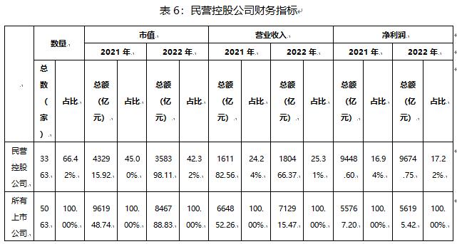 2022年,民營控股公司依舊是資本市場(chǎng)的主力軍,公司數(shù)量達(dá)3363家,占上市公司總數(shù)的66.42%,總市值達(dá)35.84萬億元,占A股總市值的42.32%。此外,民營控股公司的成長活力也獲得持續(xù)激發(fā),營業(yè)收入的占比從24.24%增至25.31%,凈利潤的占比從16.94%增至17.22%,創(chuàng)收創(chuàng)利水平穩(wěn)定上升,為上市公司發(fā)展積聚了內(nèi)在動(dòng)力。2022年,民營控股公司繳納了0.88萬億稅費(fèi),占上市公司繳納稅費(fèi)總額的18.45%。