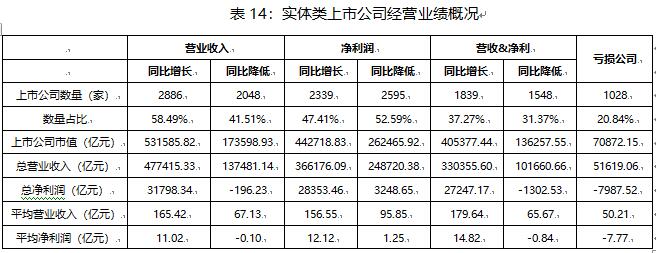 單看凈利潤指標(biāo),2022年凈利潤同比降低的公司數(shù)量超過半數(shù),達(dá)52.59%,且其平均營業(yè)收入和平均凈利潤都遠(yuǎn)低于凈利潤同比增長的上市公司,盈利能力差距明顯。再看虧損情況,2022年共有1028家實(shí)體類上市公司凈利潤發(fā)生虧損,占比20.84%,虧損總額為7987.52億元,平均每家公司虧損7.77億元。