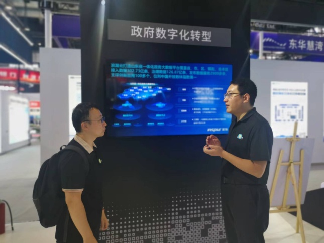 浪潮云工作人員(右一)介紹一體化政務(wù)大數(shù)據(jù)平臺 韓昱/攝