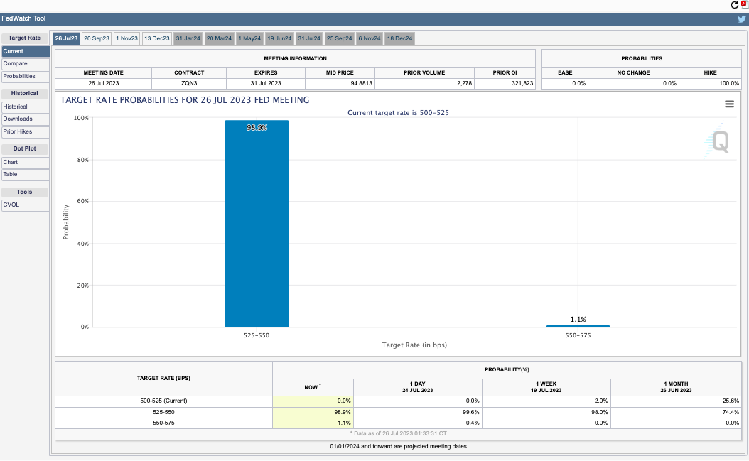 《證券日報》記者在7月26日通過芝商所FedWatch工具測算,當(dāng)前市場押注7月份美聯(lián)儲加息25個基點的概率高達(dá)98.9%,押注加息50個基點的概率為1.1%。值得一提的是,記者在7月13日通過工具測算時,市場押注美聯(lián)儲本月不加息的概率尚為7.6%,當(dāng)前此選項已不存在。