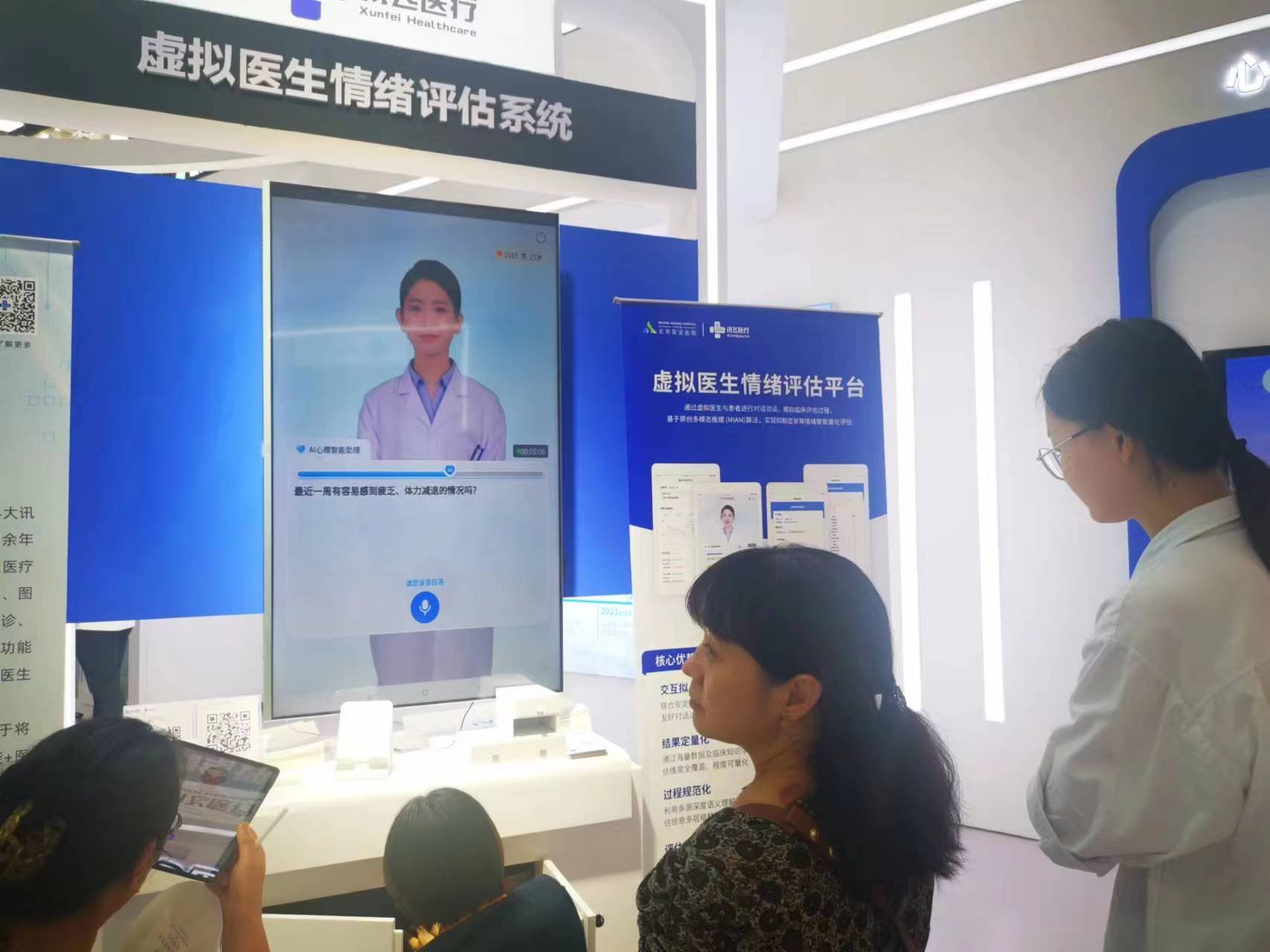 在訊飛醫(yī)療展臺(tái)虛擬醫(yī)生情緒評(píng)估平臺(tái)前,虛擬醫(yī)生正在進(jìn)行對(duì)話訪談,身穿“白大褂”的虛擬醫(yī)生,不僅擁有逼真的外觀形象,還可以基于醫(yī)療大模型等技術(shù),實(shí)現(xiàn)個(gè)性化友好對(duì)話訪談。通過虛擬醫(yī)生與患者進(jìn)行對(duì)話訪談,可以大大減輕患者心理壓力,模擬臨床評(píng)估過程,實(shí)現(xiàn)抑郁癥狀等情緒智能量化評(píng)估。
