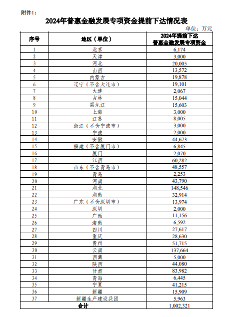 據(jù)財政部網(wǎng)站11月3日消息,為提高預算編制完整性,加快預算執(zhí)行進度,按照預算管理有關規(guī)定,現(xiàn)安排各地普惠金融發(fā)展專項資金2024年提前下達部分,合計1002321萬元。